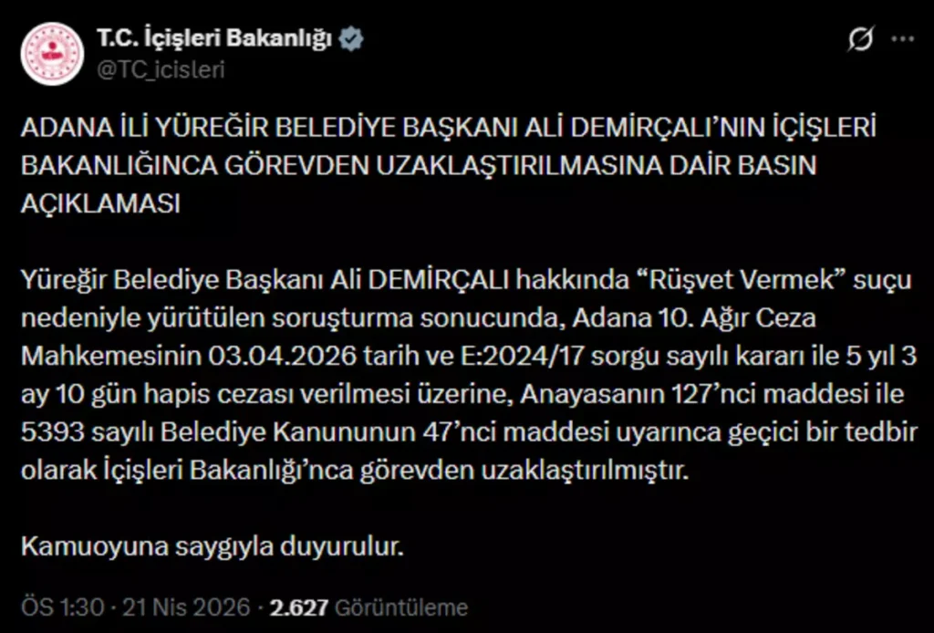 İçişleri Bakanlığı, hapis cezası verilen Adana Yüreğir Belediye Başkanı Ali Demirçalı’nın görevinden uzaklaştırıldığını duyurdu. Ali Demirçalı hakkında “Rüşvet Vermek” suçu nedeniyle yürütülen soruşturma sonucunda, 5 yıl 3 ay 10 gün hapis cezası verilmişti.