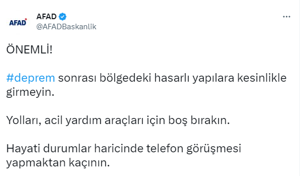 “Önemli. Deprem sonrası bölgedeki hasarlı yapılara kesinlikle girmeyin. Yolları, acil yardım araçları için boş bırakın. Hayati durumlar haricinde telefon görüşmesi yapmaktan kaçının.”