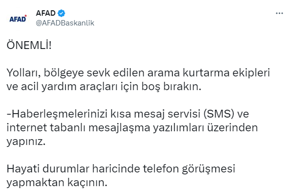 “Yolları, bölgeye sevk edilen arama kurtarma ekipleri ve acil yardım araçları için boş bırakın. -Haberleşmelerinizi kısa mesaj servisi (SMS) ve internet tabanlı mesajlaşma yazılımları üzerinden yapınız. Hayati durumlar haricinde telefon görüşmesi yapmaktan kaçının.”