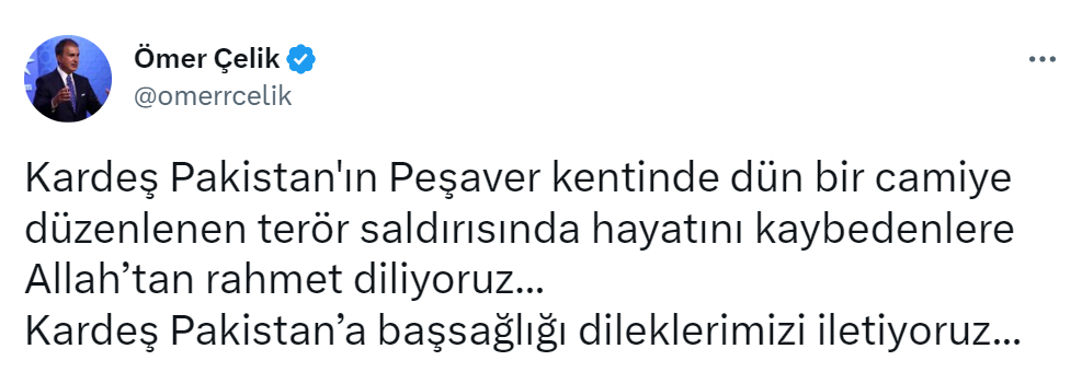 “Kardeş Pakistan’ın Peşaver kentinde dün bir camiye düzenlenen terör saldırısında hayatını kaybedenlere Allah’tan rahmet diliyoruz. Kardeş Pakistan’a başsağlığı dileklerimizi iletiyoruz.”
