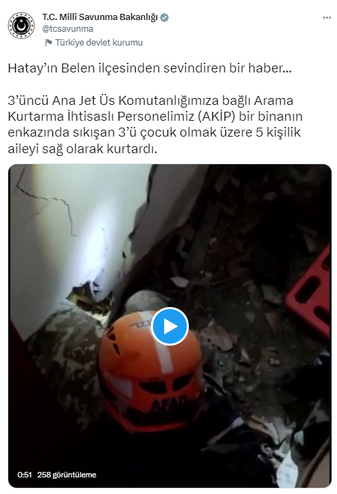 “Hatay’ın Belen ilçesinden sevindiren bir haber. 3’üncü Ana Jet Üs Komutanlığımıza bağlı Arama Kurtarma İhtisaslı Personelimiz (AKİP) bir binanın enkazında sıkışan 3’ü çocuk olmak üzere 5 kişilik aileyi sağ olarak kurtardı.”