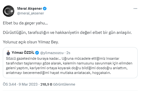Haberler Dijital Gazete Akşener: “Elbet bu da geçer yahu…” Akşener: “Elbet bu da geçer yahu…” haberiniz tarafından yayınlandı 9 Mart 2023, 16:03 yayınlandı 9 Mart 2023, 16:05 güncellendi Paylaş Bu Yazıyı Paylaş veya linki kopyala Kopyala Akşener Twitter hesabından yaptığı paylaşımda şunları kaydetti: “Elbet bu da geçer yahu… Dürüstlüğün, tarafsızlığın ve hakkaniyetin değeri elbet bir gün anlaşılır. Yolunuz açık olsun Yılmaz Bey.”
