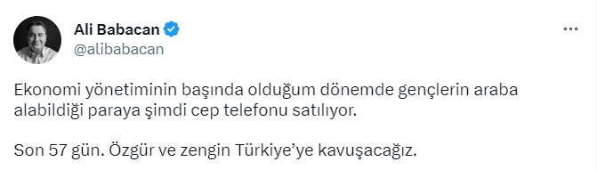 Haberler Dijital Gazete Babacan: “Özgür ve zengin Türkiye’ye kavuşacağız” Babacan: “Özgür ve zengin Türkiye’ye kavuşacağız” haberiniz tarafından yayınlandı 18 Mart 2023, 20:19 yayınlandı 18 Mart 2023, 20:20 güncellendi Paylaş Bu Yazıyı Paylaş veya linki kopyala Kopyala Babacan, sosyal medya hesabından yaptığı paylaşımda, “Ekonomi yönetiminin başında olduğum dönemde gençlerin araba alabildiği paraya şimdi cep telefonu satılıyor. Son 57 gün. Özgür ve zengin Türkiye’ye kavuşacağız.” ifadelerini kullandı.