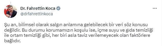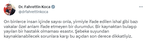 “Deprem bölgesinde salgın hastalık riskine karşı Erken Uyarı Sistemi üzerinden sendromik sürveyans yapılmaktadır. Bu çalışma sayesinde, risk oluşturabilecek enfeksiyonlara ilişkin erken dönemde veri toplanıp analiz edilmektedir. Erken Uyarı Sistemi tüm bölgede devrede. Şu an, bilimsel olarak salgın anlamına gelebilecek bir veri söz konusu değildir. Bu durumu korumamızın koşulu ise, içme suyu ve gıda temizliği ile ortam temizliği gibi, her biri asla taviz verilemeyecek olan faktörlere bağlıdır. On binlerce insan içinde sayısı onla, yirmiyle ifade edilen ishal gibi bazı vakalar özel anlam ifade etmeyen bir durumdur. Bir kaynaktan bulaşıp yayılan bir hastalık olmaması esastır. Şebeke suyundan kaynaklanabilecek sorunlara karşı bu açıdan son derece dikkatliyiz.”