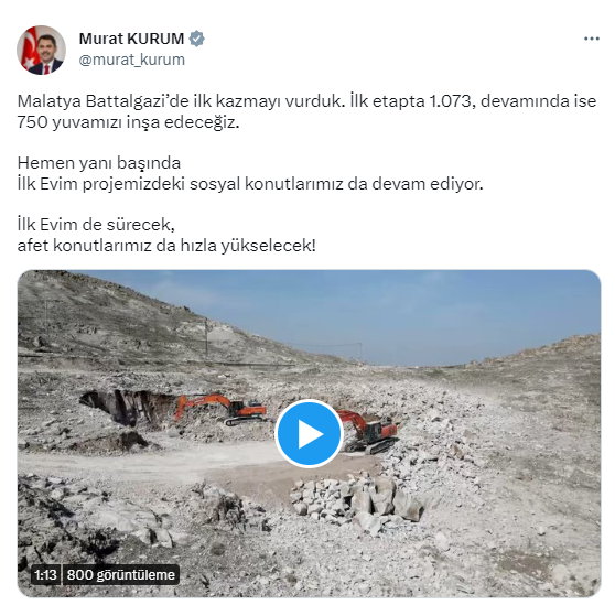 “Malatya Battalgazi’de ilk kazmayı vurduk. İlk etapta bin 73, devamında ise 750 yuvamızı inşa edeceğiz. Hemen yanı başında İlk Evim projemizdeki sosyal konutlarımız da devam ediyor. İlk Evim de sürecek, afet konutlarımız da hızla yükselecek”