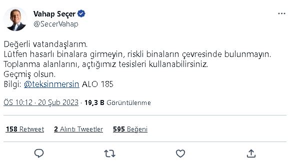 Yaşanan bu depremin ardından Mersin Büyükşehir Belediye Başkanı Vahap Seçer sosyal medya hesabından vatandaşları uyardı.