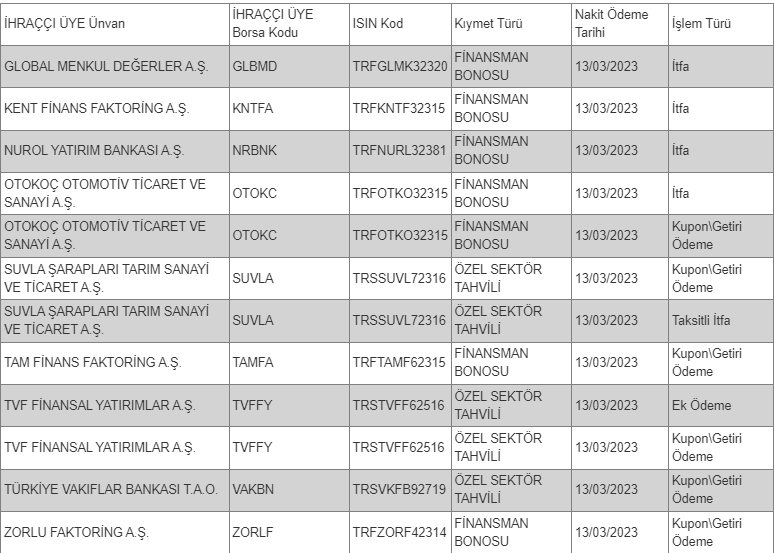 Haberler Ekonomi Borçlanma araçları, yatırım fonları ve varant itfa/kupon/getiri/ nakdi uzlaşı ödeme işlemleri Borçlanma araçları, yatırım fonları ve varant itfa/kupon/getiri/ nakdi uzlaşı ödeme işlemleri haberiniz tarafından yayınlandı 13 Mart 2023, 22:14 yayınlandı 14 Mart 2023, 11:03 güncellendi Paylaş Bu Yazıyı Paylaş veya linki kopyala Kopyala Merkezi Kaydi Sistemde ihraççı şirket bildirimleri doğrultusunda gerçekleştirilen hak kullanım ödemelerine ait kayıtlar şöyle: