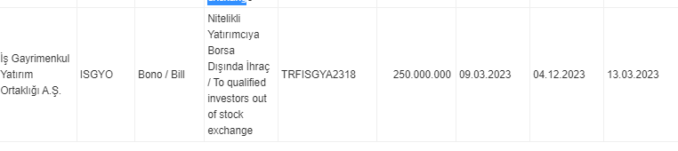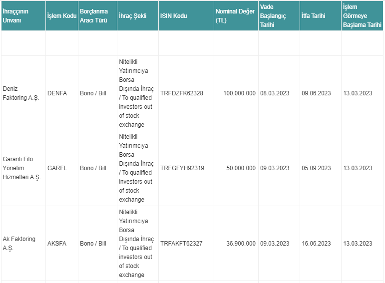 Haberler Ekonomi Borçlanma araçlarının / kira sertifikalarının işlem görmeye başlaması Borçlanma araçlarının / kira sertifikalarının işlem görmeye başlaması haberiniz tarafından yayınlandı 9 Mart 2023, 19:53 yayınlandı 9 Mart 2023, 19:55 güncellendi Paylaş Bu Yazıyı Paylaş veya linki kopyala Kopyala Borçlanma Araçları Piyasası Kesin Alım Satım Pazarı’nda işlem görmeye başlayacak borçlanma araçları / kira sertifikaları bilgileri şöyle: