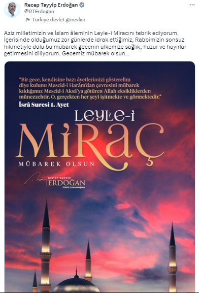 Cumhurbaşkanı Erdoğan, sosyal medya hesabından paylaştığı mesajda, “Aziz milletimizin ve İslam aleminin Leyle-i Miracını tebrik ediyorum. İçerisinde olduğumuz zor günlerde idrak ettiğimiz, Rabbimizin sonsuz hikmetiyle dolu bu mübarek gecenin ülkemize sağlık, huzur ve hayırlar getirmesini diliyorum. Gecemiz mübarek olsun…” ifadelerini kullandı.