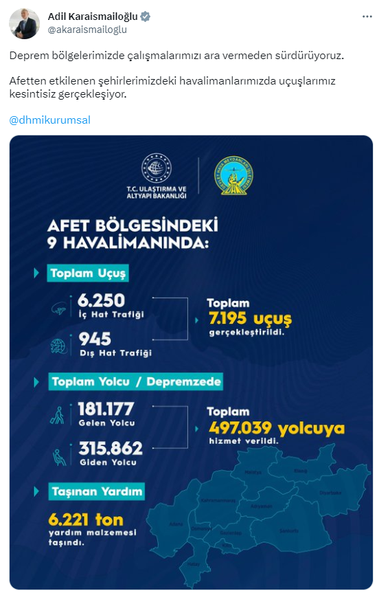 “Deprem bölgelerimizde çalışmalarımızı ara vermeden sürdürüyoruz. Afetten etkilenen şehirlerimizdeki havalimanlarımızda uçuşlarımız kesintisiz gerçekleşiyor. Afet bölgesindeki 9 havalimanında; 6 bin 250 iç hat trafiği, 945 dış hat trafiği toplam 7 bin 195 uçuş gerçekleştirildi. 181 bin 177 gelen yolcu, 315 bin 862 giden yolcu toplam 497 bin 39 yolcuya hizmet verildi. 6 bin 221 ton yardım malzemesi taşındı.”