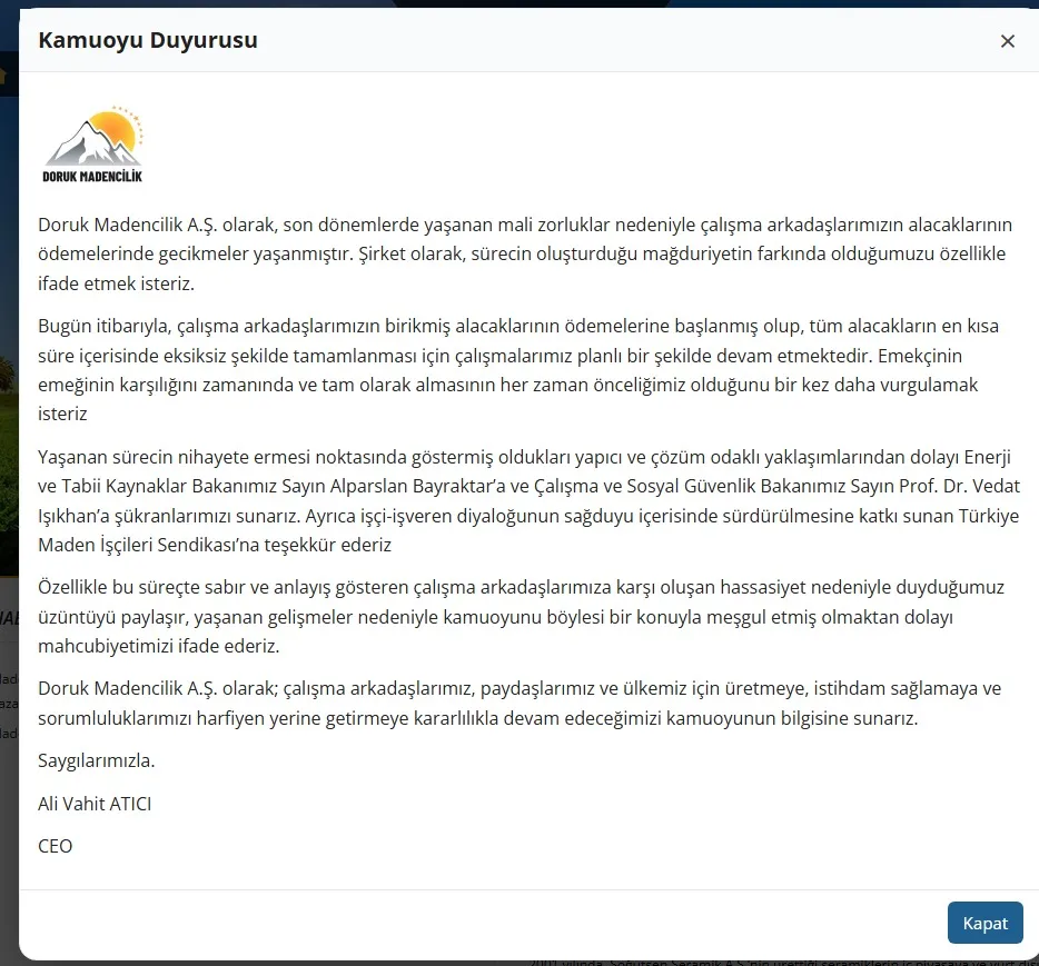 Madencilerin hak arayışı sürerken, şirket yönetiminin geçmişi ve siyasi bağlantıları üzerine yapılan tartışmalar da giderek büyüyor. İşçilerin alacaklarının ödenip ödenmeyeceği ve verilen sözlerin ne ölçüde yerine getirileceği ise sürecin en kritik başlığı olmaya devam ediyor.