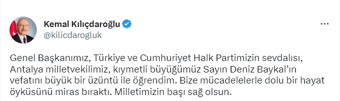 Kılıçdaroğlu, sosyal medya hesabından yaptığı açıklamada, “Genel Başkanımız, Türkiye ve Cumhuriyet Halk Partimizin sevdalısı, Antalya milletvekilimiz, kıymetli büyüğümüz Sayın Deniz Baykal’ın vefatını büyük bir üzüntü ile öğrendim. Bize mücadelelerle dolu bir hayat öyküsünü miras bıraktı. Milletimizin başı sağ olsun.” ifadelerine yer verdi.