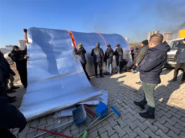 İBB, dışarda kalan vatandaşlara acil çözüm sunmak için ısı yalıtımlı çadırları Hatay’ın çeşitli ilçelerine ulaştırdı.
