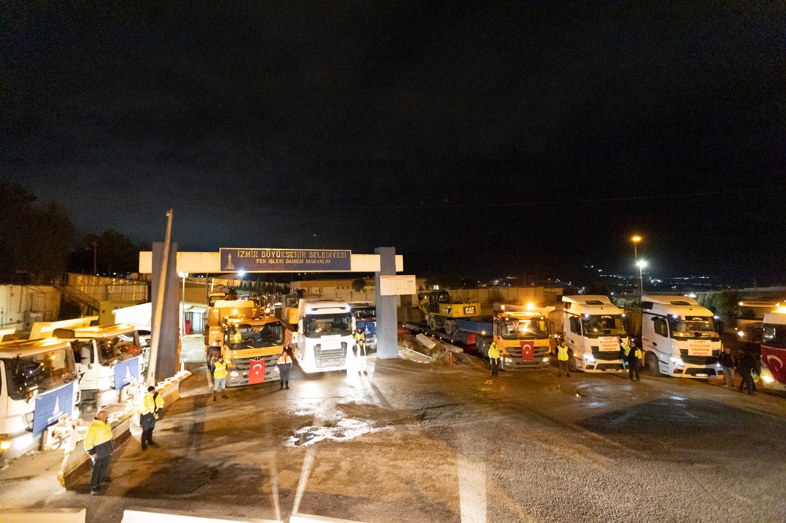 İzmir Büyükşehir Belediyesi İtfaiye Dairesi Başkanlığı afet bölgesine AKS aracı, 2 AKS itfaiye ambulansı, 4 ambulans, kurtarma aracı, yangın arazözü, bir köpekle kurtarma timi aracı, hizmet aracı, tamir bakım aracı olmak üzere toplam 16 araç ve 84 personel, 3 köpekli kurtarma timi gönderdi.