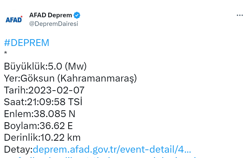Haberler Dijital Gazete Kahramanmaraş’da 5.0 büyüklüğünde deprem Kahramanmaraş’da 5.0 büyüklüğünde deprem haberiniz tarafından yayınlandı 7 Şubat 2023, 21:46 yayınlandı 7 Şubat 2023, 21:47 güncellendi Paylaş Bu Yazıyı Paylaş veya linki kopyala Kopyala Afet ve Acil Durum Yönetimi Başkanlığı (AFAD) verilerine göre, saat 21:09’da Kahramanmaraş Göksun ilçesinde meydana gelen deprem, yerin 10.22 kilometre derinliğinde gerçekleşti. Depremin şiddeti, 5.0 olarak ölçüldü.