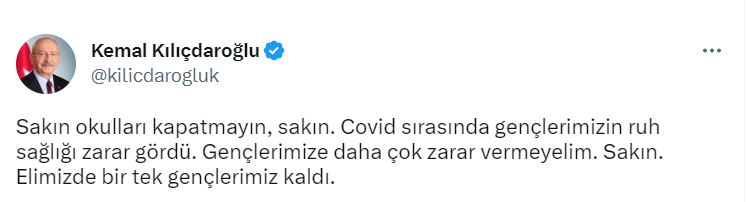 Haberler Dijital Gazete Kılıçdaroğlu: “Sakın okulları kapatmayın, sakın” Kılıçdaroğlu: “Sakın okulları kapatmayın, sakın” haberiniz tarafından yayınlandı 11 Şubat 2023, 17:59 yayınlandı 11 Şubat 2023, 18:00 güncellendi Paylaş Bu Yazıyı Paylaş veya linki kopyala Kopyala Kılıçdaroğlu’nun sosyal medya hesabından yaptığı açıklama şöyle: “Sakın okulları kapatmayın, sakın. Covid sırasında gençlerimizin ruh sağlığı zarar gördü. Gençlerimize daha çok zarar vermeyelim. Sakın. Elimizde bir tek gençlerimiz kaldı.”