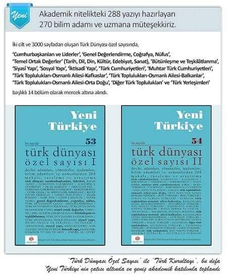 Türkiye’nin yakından tanıdığı siyaset ve kültür adamı Hasan Celal Güzel bir gün aniden telefonla aradı. Yeni Türkiye Dergisi’nin son sayısında konunun “Türk Dünyası” olduğunu ve bir makale yazmamı istedi. Ben de seve seve kabul ettim. “Güneydoğu Avrupa’(Balkanlar)da Türk İzleri” konulu bir makale yazdım. Ortaya iki cilt, 288 yazı ve 3000 sayfadan oluşan muhteşem bir yayın ortaya çıkmış. Mutlaka alın ve okuyun, kütüphanenizde bulunsun. Emeği geçenlere sonsuz teşekkürler…