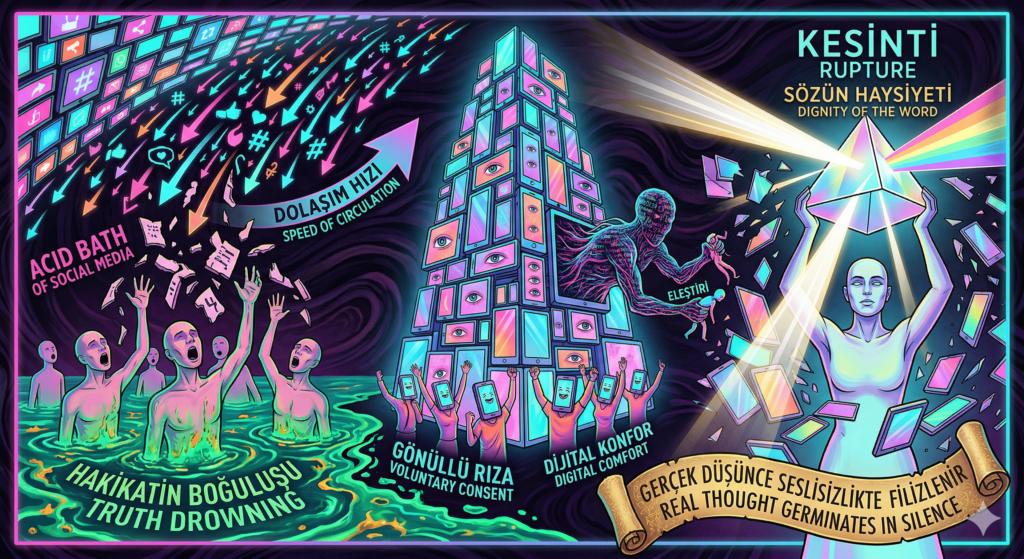 Bu devasa mekanizma yıkılmasa bile, bir “Kesinti” ile sarsılabilir. Kesinti; hızın reddi, görünürlükten feragat ve sözün haysiyetini korumak adına gösterilen o soylu susma iradesidir. Zira gerçek bir düşünce, ekranın parıltısında değil; o akış kesildiğinde başlayan tekinsiz sessizlikte filizlenir.