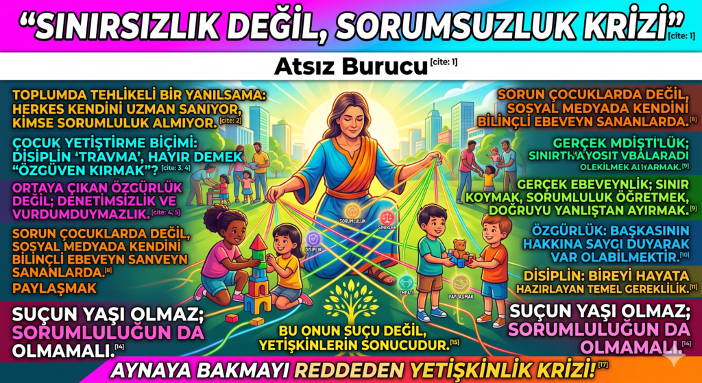 Toplumda tehlikeli bir yanılsama büyüyor: Herkes kendini uzman sanıyor, herkes fikir sahibi ama kimse sorumluluk almıyor. Bunun en çarpıcı sonucu ise çocuk yetiştirme biçiminde karşımıza çıkıyor. Disiplin “travma”, sınır koymak “baskı”, hayır demek ise “özgüven kırmak” olarak etiketlenmiş durumda. Ortaya çıkan şey özgürlük değil; denetimsizlik ve vurdumduymazlık.