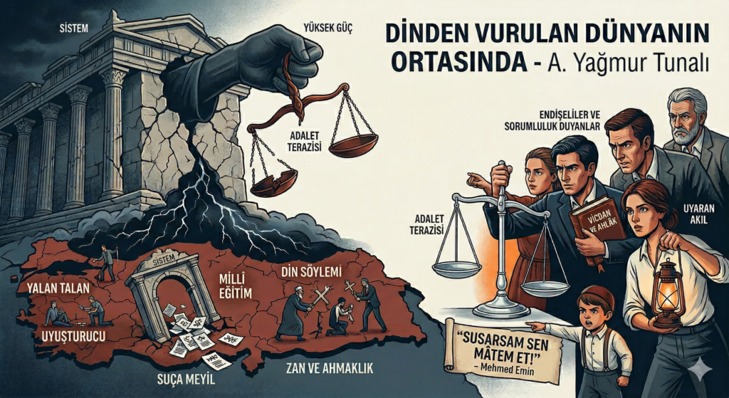 Yağmur Tunalı tarafından kaleme alınan bu köşe yazısı, toplumsal ahlakın çöküşünü ve Türkiye’nin içine düştüğü kuralsızlık sarmalını sert bir dille eleştirmektedir. Yazar, dini değerlerin siyasi ve ideolojik emellere alet edilerek toplumun vicdanının köreltildiğini ve bu durumun adaletsizliği körüklediğini savunmaktadır. Devlet kurumlarındaki sistem kaybının mafyalaşmaya ve eğitimde kalitesizliğe yol açtığı vurgulanırken, hukukun üstünlüğünün yeniden tesis edilmesi gerektiği üzerinde durulmaktadır. Dış dünyadaki küresel kötülüklerle mücadele edebilmek için önce içerideki adaletin ve birliğin sağlanması gerektiği temel bir zorunluluk olarak sunulmaktadır. Metin nihayetinde, yaşanan bu büyük yıkımdan kurtulmak için aklı ve sorumluluk bilincini göreve çağıran bir uyarı niteliği taşımaktadır.