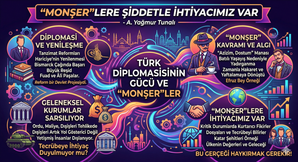 A. Yağmur Tunalı’nın kaleme aldığı bu yazı, Türk diplomasisinde yetişmiş, birikimli devlet adamlarını niteleyen “monşer” kavramının tarihsel gelişimini ve toplumsal algısını incelemektedir. Yazara göre bu terim, Tanzimat döneminden itibaren yenileşme hareketlerine karşı çıkanların bir yaftalaması olarak doğmuş, ancak zamanla hariciye teşkilatının nitelikli yüzünü temsil eder hale gelmiştir. Günümüzde bu ifadenin bir hakaret ve dışlama aracı olarak kullanılmasının, devletin kurumsal hafızasına ve diplomatik tecrübesine ciddi zararlar verdiği savunulmaktadır. Özellikle kritik bölgelerdeki dış politika yönetiminde, bu eğitimli kadroların bilgi ve deneyimine her zamankinden daha fazla ihtiyaç duyulduğu vurgulanmaktadır. Sonuç olarak kaynak, liyakatli diplomatların kenara itilmesinin milli çıkarlar açısından yaratabileceği olumsuz sonuçlara dikkat çekerek bu değerlere sahip çıkılması gerektiğini hatırlatmaktadır.