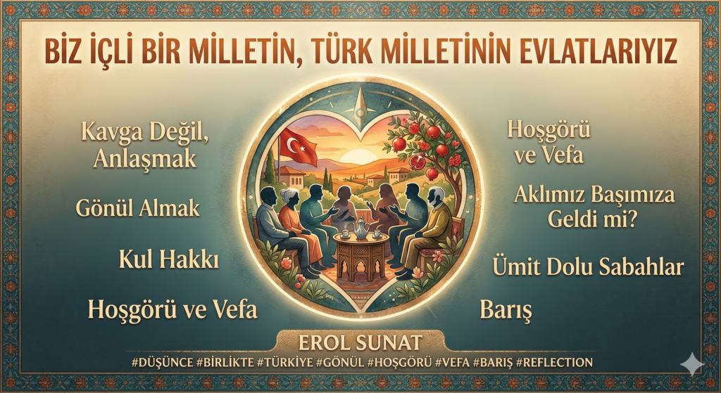 Erol Sunat’ın bu kaleme aldığı metin, Türk milletinin toplumsal ve bireysel ilişkilerindeki uzlaşma kültüründen uzaklaşmasını ve artan kutuplaşmanın getirdiği manevi yıkımı ele almaktadır. Yazar, bayramlar ve kutsal günler gibi barış fırsatlarının inat, kibir ve gurur nedeniyle heba edilmesine sitem dolu bir dille dikkat çeker. Toplumdaki hoşgörünün yerini öfke ve dargınlığa bırakması, “kul hakkı” ve “kırık kalpler” temaları üzerinden derin bir öz eleştiri süzgecinden geçirilir. Karamsarlığa teslim olmak yerine, hayatta olunduğu sürece her yeni sabahın bir telafi ve başlangıç imkânı sunduğu vurgulanır. Sonuç olarak eser, içli bir milletin fertlerini kendi hatalarıyla yüzleşmeye ve geç olmadan vefa ile sevgi köprülerini yeniden kurmaya davet etmektedir.