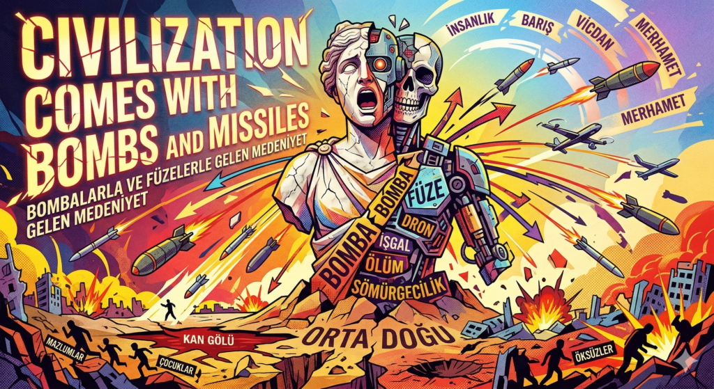 Erol Sunat, medeniyet maskesi altında yürütülen işgal, savaş ve sömürgecilik faaliyetlerini sert bir dille eleştirmektedir. Yazar, Batılı güçlerin Orta Doğu ve diğer coğrafyalara özgürlük vaadiyle aslında yalnızca yıkım, füze ve ölüm getirdiğini savunmaktadır. Tarihsel süreçte Kızılderililerden Osmanlı sonrasına kadar uzanan bu trajik tablo, günümüzde İran, Gazze ve Doğu Türkistan gibi bölgelerdeki insani dramlarla ilişkilendirilmektedir. Bölgenin huzurunun emperyalist müdahaleler ve yerel diktatörlerin iş birliğiyle bozulduğu, gerçek insani erdemlerin ise bu süreçte tamamen yok sayıldığı vurgulanmaktadır. Sonuç olarak yazar, mevcut dünya düzeninin sunduğu bu “kanlı medeniyet” anlayışının insanlığı büyük bir enkaza sürüklediğini ifade etmektedir.