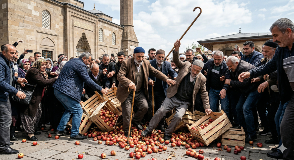 Yüzlerce kişi, bir kasa elma için birbirinin üzerine çullandı. İtiş kakış, tekme, düşme… İki yaşlı adamın bastonları havada kaldı. Elmalar ayaklar altında parçalandı. Ve o an, bu ülkenin “güçlü Türkiye” vaatlerinin ne hale geldiği, en çıplak haliyle görüldü.