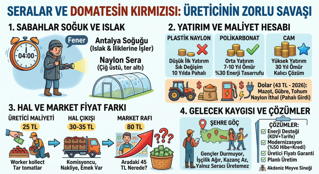 Bir sabah daha seraya gider üretici. Naylonun altında, alın teriyle yoğrulmuş domatesler onu bekler. Toplar, kasalar, yollar.