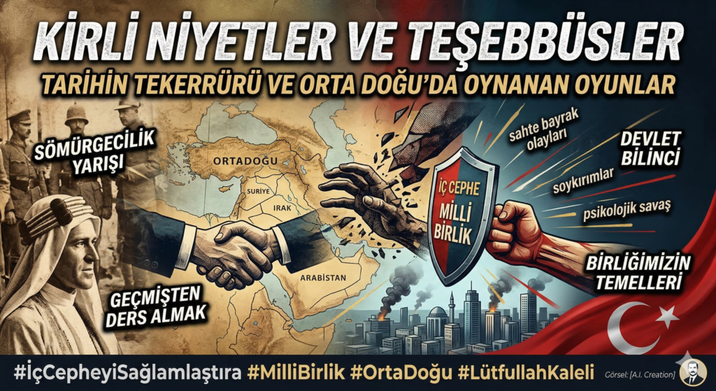 Lütfullah Kaleli tarafından kaleme alınan bu metin, günümüzdeki jeopolitik çatışmalar ile geçmişteki sömürgeci faaliyetler arasında güçlü paralellikler kurmaktadır. Yazar, Orta Doğu üzerindeki küresel oyunların ve kirli niyetlerin tarihsel süreçte değişmediğini, sadece yöntemlerin güncellendiğini savunmaktadır. Toplumsal birliği bozmaya yönelik psikolojik savaş taktiklerine karşı dikkatli olunması gerektiğini vurgulayarak halkı uyanık olmaya çağırmaktadır. Türkiye’nin bekası için iç cephenin sağlam tutulması ve devlet bilincinin her yaştan vatandaş tarafından sahiplenilmesi temel çözüm yolu olarak sunulmaktadır. Özellikle kültürel ve siyasi ayrışmaların dış güçlerin emellerine hizmet ettiği belirtilerek, milli dayanışmanın güçlendirilmesi hayati bir zorunluluk olarak nitelendirilmektedir. Son olarak, tarihten ders çıkararak sömürgeci aparatların girişimlerini boşa çıkaracak bir milli duruşun sergilenmesi gerektiği mesajı verilmektedir.