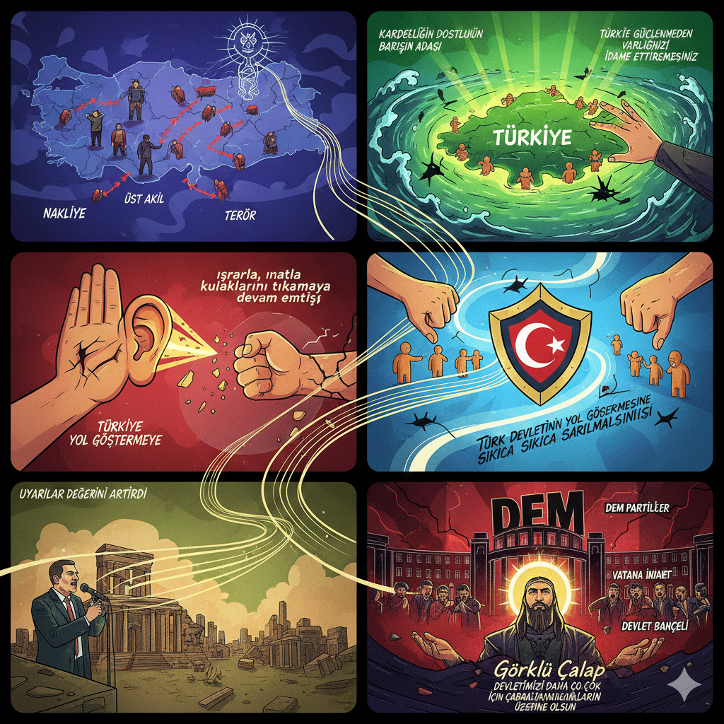Gelelim DEM partililerin 09/01/2026 da TBMM de yaptıkları basın açıklamasına, Halep operasyonları nedeni ile Türkiye Cumhuriyeti devletini ve bakanlarını suçlamaları, acayip sloganlar atmalarını manidar buluyorum. 13/01/2026 günü yaptıkları açıklamalar Mazlum Abdi’nin Türkiye’ye davet edilmesini istemeleri, cephe gerisini zaafa uğratmayı amaçlamaktadır. Devlet Bahçeli gereken cevapları vermiştir. Ancak bu kalın kafalılar, tatlı dilden -hoş görüden anlamazlar, anlamaya da niyetleri yok. Bunlar, benim gönlümden geçenlere göre; vatana ihanetten yargılansalar ne güzel olur.