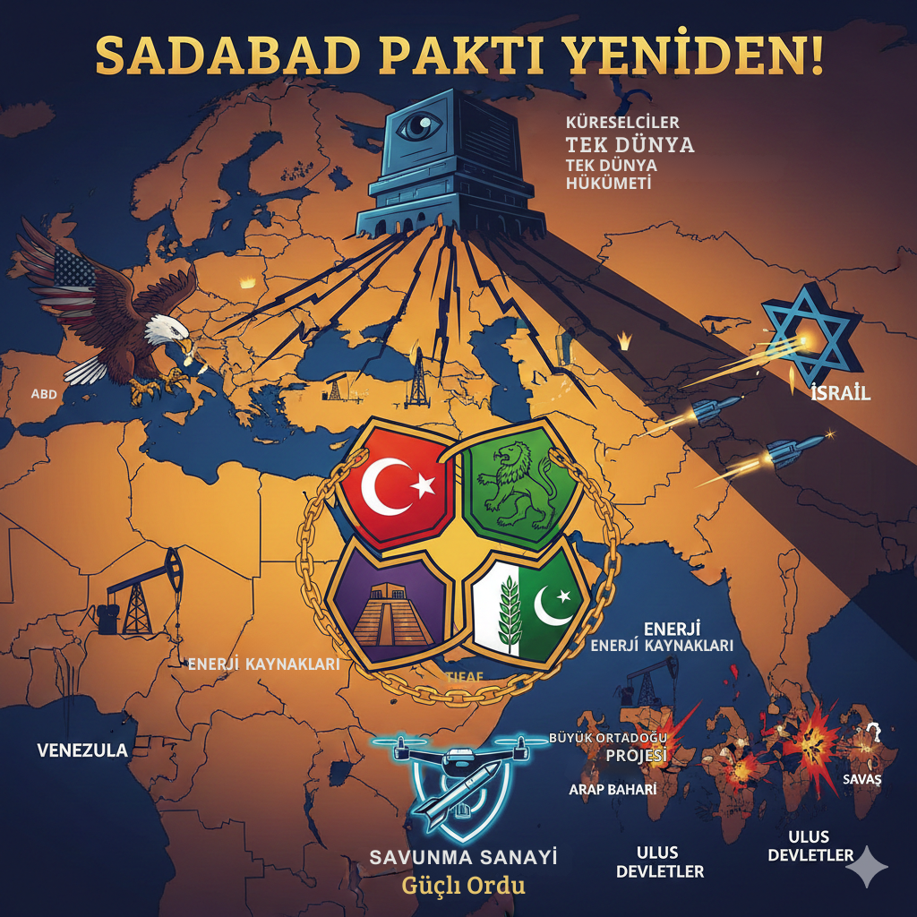 Yazar, dünyayı tek elden yönetmeyi amaçlayan küreselci güçlerin ulus devletleri zayıflatmak için ekonomik ve askeri baskılar uyguladığını ileri sürmektedir. Metne göre, Büyük Ortadoğu Projesi ve Arap Baharı gibi girişimler aslında bölgedeki kaynakları kontrol etmek ve İsrail’in güvenliğini sağlamak amacıyla kurgulanmıştır. Irak ve İran’ın ardından asıl hedefin Türkiye olduğu savunulurken, bu emperyalist tehditlere karşı güçlü bir savunma ve ekonomi politikası izlenmesi gerektiği vurgulanmaktadır. Yazar, dış müdahalelere karşı koyabilmek adına Türkiye’nin liderliğinde İran, Irak ve Pakistan ile birlikte tarihî Sadabad Paktı’nın acilen yeniden canlandırılmasını önermektedir. Bu bölgesel ittifak, küresel sermayenin ve müttefiklerinin bölgedeki yıkıcı faaliyetlerine karşı stratejik bir savunma kalkanı olarak sunulmaktadır.
