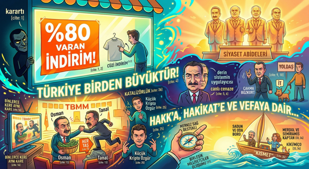 Bu köşe yazısı, güncel siyaset ve ticaret dünyasındaki yozlaşmayı eleştiren, geçmişle bugünü kıyaslayan sert bir eleştiri niteliğindedir. Yazar, ticari afişlerdeki indirim aldatmacalarından yola çıkarak toplumdaki genel güven kaybına ve siyasi aktörlerin ideolojik tutarsızlıklarına dikkat çekmektedir. Türkiye’nin eski liderlerine duyulan özlemi dile getirirken, mevcut meclis kavgalarını ve medyada bu görüntülerin tekrar edilmesini ağır bir dille yermektedir. Siyasi partiler arasındaki geçişleri ve etik değerlerin kaybını ele alan yazar, ülkenin kurtuluşu için merkez sağ temelli bir birleşmeyi tek çare olarak sunmaktadır. Yazı, toplumsal meselelerden kişisel bir taziye mesajına evrilerek duygusal bir veda ile son bulmaktadır.