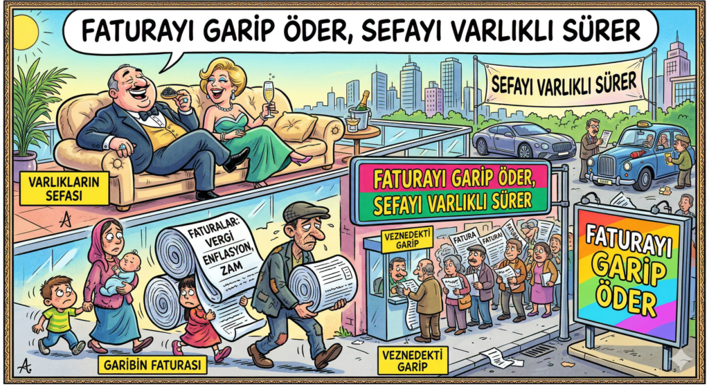 Hepsi kurallardan muaftır ama garibim köylü kardeşimiz tüplü, külüstür arabasıyla yola çıkmaya görsün; ceza yazmak için bütün trafik polisleri seferber olur… Fakirin borcunun affedildiğini duydunuz mu? O borcun üstüne; avukat masrafı, icra harcı vs. eklenerek devasa hale getirilir ama mutlaka tahsil edilir.