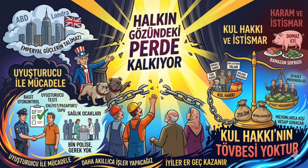 Bu metin, Türkiye’deki siyasi ve sosyal yozlaşmayı eleştirirken mevcut iktidarın dini duyguları bir istismar aracı olarak kullandığını ileri sürmektedir. Yazar, FETÖ gibi yapıların dış güçlerden aldığı güvencelerle pervasızca hareket ettiğini ve ülkedeki etik çöküşün engellenemediğini savunmaktadır. Toplumdaki uyuşturucu sorunuyla mücadele için sivil denetim mekanizmaları önerilirken, asıl büyük tehlikenin halkın ekonomik haklarının gasbedilmesi olduğu vurgulanmaktadır. Kul hakkı kavramı üzerinden ekonomik adaletsizliklere dikkat çekilerek, siyasi figürlerin Müslüman gibi görünerek şahsi menfaat peşinde koştukları iddia edilmektedir. Son olarak yazar, halkın bu algı operasyonlarına karşı bilinçlenmesi gerektiğini ve sadece slogan atmanın çözüm getirmeyeceğini ifade etmektedir.