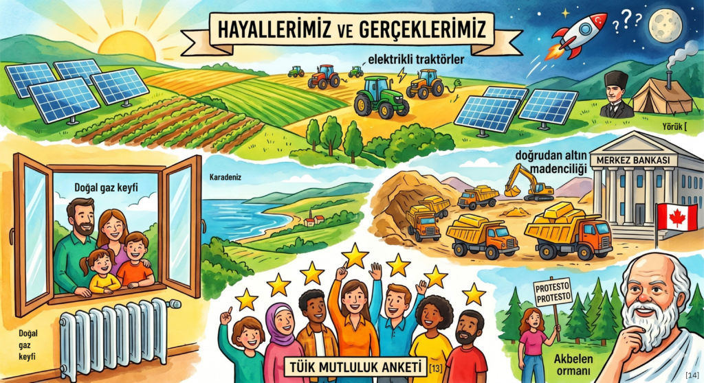 Bu makale, Türkiye’nin mevcut sosyo-ekonomik ve politik manzarasını ironik bir dille eleştiren hiciv dolu bir anlatı sunmaktadır. Yazar, ülkenin enerji bağımsızlığı ve teknolojik ilerlemesi hakkındaki ütopik hayalleri gerçek hayattaki ekonomik zorluklar ve adaletsizliklerle ustaca kıyaslamaktadır. Hukukun üstünlüğündeki zayıflıklar, vatandaşın üzerindeki ağır vergi yükleri ve gelir dağılımındaki derin uçurumlar vurgulanan temel meseleler arasındadır. Akbelen direnişi gibi toplumsal mücadeleler üzerinden halkın doğayı ve geleceğini koruma azmi ön plana çıkarılmaktadır. Sonuç olarak eser, toplumun bir kesiminin refah içinde yaşadığı, büyük bir çoğunluğun ise geçim derdiyle boğuştuğu acı bir gerçeği gözler önüne sermektedir.