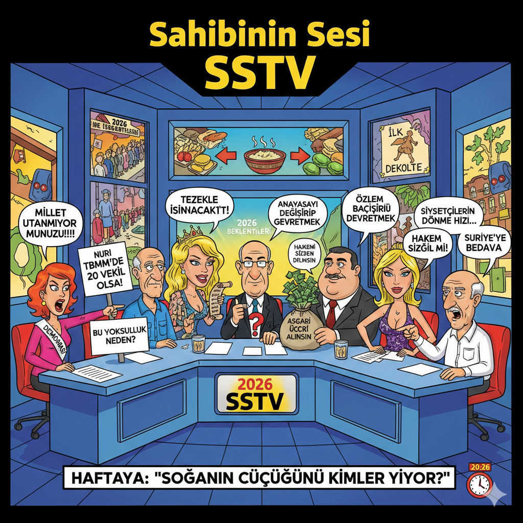 Sahibinin Sesi SSTV yılın ilk açık oturumunu sunar. Konuklar İlker Ortaylı, iktidardan Özlem Ballızengin, muhalefette Serap Kadıgil, Patronlardan Mehmet Cingöz, işçiler adına Hakkı Yok, emeklileri temsilen Nuri Kuyruk, sanat camiasından Hülya Kaşar. Sayın Kaşar açık oturum diye böyle açık saçık giyinmenize gerek yok.