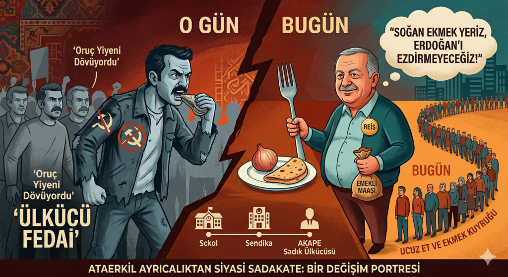 Bu köşe yazısı, geçmişte ülkücü kimliğiyle tanınan ancak günümüzde AK Parti destekçisine dönüşen bir bireyin eleştirel bir portresini çizmektedir. Yazar, ana karakterin işçi emeklisi olduktan sonra değişen siyasi duruşunu ve sahip olduğu ekonomik ayrıcalıkları sorgulayan bir bakış açısı sunmaktadır. Karakterin, kardeşlerinden aldığı miras destekleri ve devletten aldığı yüksek emekli maaşı sayesinde hayat standartlarını koruduğu vurgulanmaktadır. Kaynak, bu kişinin içinde bulunduğu rahat yaşam koşulları sebebiyle iktidarın ekonomi politikalarını fanatikçe savunduğunu ileri sürmektedir. Sonuç olarak anlatı, kişisel çıkarların ve maddi refahın siyasi görüşler üzerindeki belirleyici etkisini trajikomik bir dille özetlemektedir.