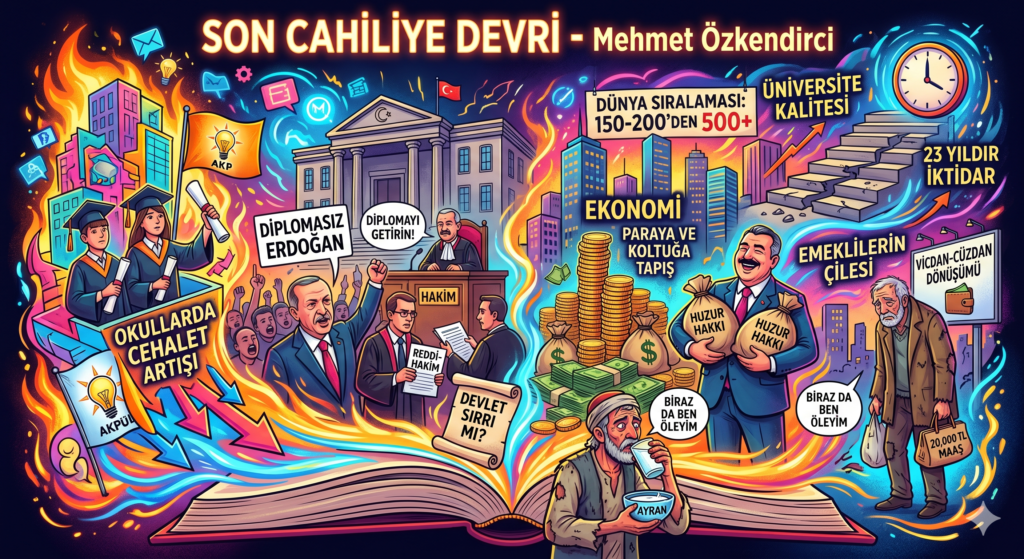 Yazar Mehmet Özkendirci, Türkiye’deki eğitim sisteminin niteliksizleşmesini ve liyakat kaybını eleştirerek modern bir cahiliye devrinin yaşandığını savunmaktadır. Metin, üniversite kalitesindeki düşüş ile siyasi figürlerin diploma tartışmalarını odağına alarak toplumsal bir adaletsizlik tablosu çizmektedir. İktidarın yönetim anlayışı üzerinden ekonomik uçurumlar ve etik değerlerin yitirilmesi gibi konulara değinen yazar, halkın yoksullaşırken bir kesimin refah içinde yaşamasını sert bir dille eleştirmektedir. Yozlaşmış bir düzenin portresini çizen bu anlatı, adaletin yerini şahsi çıkarların aldığı bir dönemi sorgulamaktadır. Sonuç olarak kaynak, Türkiye’nin güncel sosyo-politik sorunlarını ve toplumsal vicdandaki aşınmayı karamsar bir perspektifle özetlemektedir.
