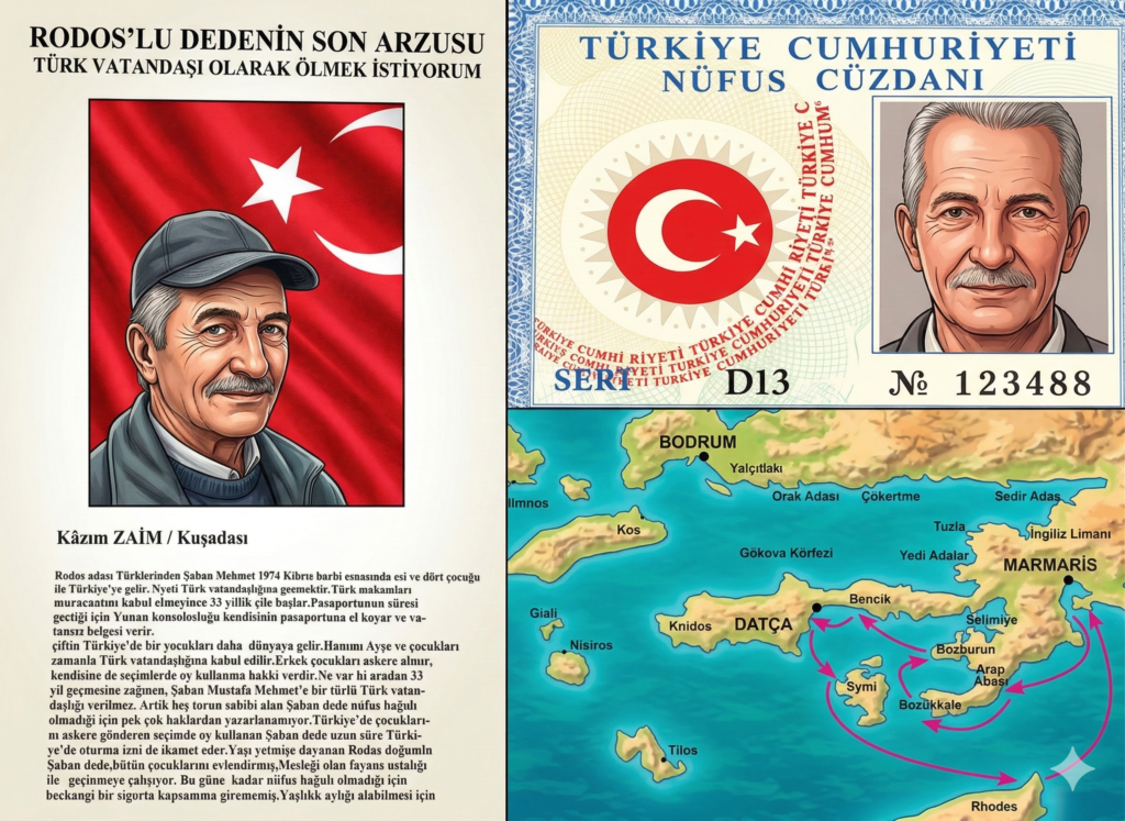 “Bir tanıdıktan duyduğum acıklı bir insan haberi beni derinden etkilemişti. 1974 yılında ailesi ile Rodos adasından göçen Şaban Bey, aradan yıllar geçmesine rağmen bütün ailesi Türk vatandaşlığına alınmış fakat devlet kendisine vatandaşlık hakkı vermemiş dediler.