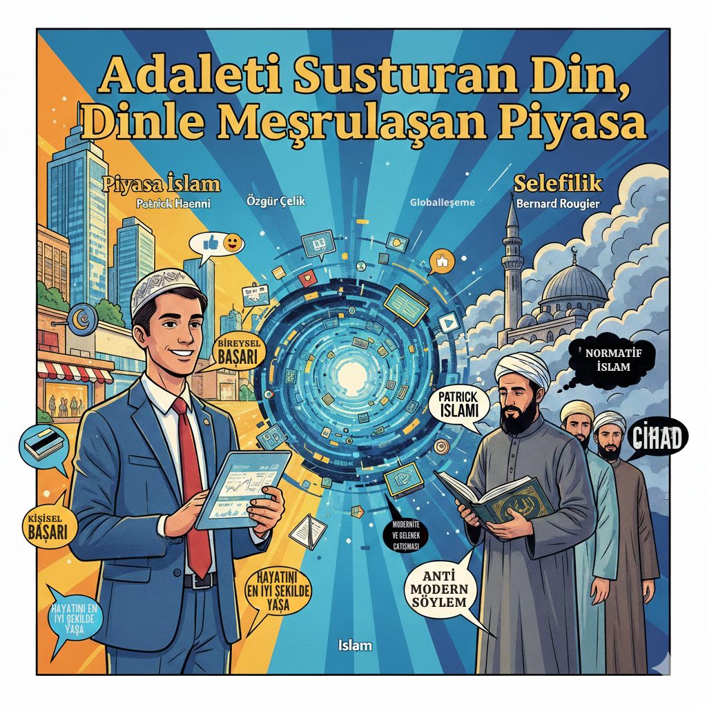 Özgür Çelik’in bu incelemesi, Patrick Haenni ve Bernard Rougier gibi isimlerin çalışmaları üzerinden siyasal İslam’ın geçirdiği yapısal dönüşümü ve güncel dindarlık biçimlerini tartışmaktadır. Haenni, İslamcılığın klasik siyasi iddialarından uzaklaşarak bireysel başarı, girişimcilik ve tüketim kültürüyle eklemlenen bir “Piyasa İslamı” modeline evrildiğini savunmaktadır. Bu süreçte dini pratiklerin dünya ile uyumlu hale geldiği ve kişisel gelişim odaklı yeni bir dindarlık anlayışının doğduğu vurgulanmaktadır. Ancak metin, Selefilik gibi daha katı ve kuralcı akımların varlığını sürdürdüğünü hatırlatarak, İslami hareketlerin tamamen piyasaya teslim olmadığını göstermektedir. Sonuç olarak kaynak, İslamcılığın sona ermek yerine ideolojik ve pratik açıdan çeşitlenerek farklı biçimlerde yeniden üretildiğini ifade etmektedir. Metin, Müslüman toplumlardaki bu karmaşık değişimi modernite ve küreselleşme bağlamında kapsamlı bir şekilde analiz etmektedir.