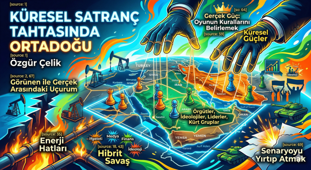 Özgür Çelik’in bu çalışması, Ortadoğu’yu yüzeysel çatışmaların ötesinde, küresel güçlerin stratejik hamleler yaptığı karmaşık bir satranç tahtası olarak nitelendirmektedir. Yazar, bölgedeki gerilimlerin tesadüfi olmadığını, aksine büyük devletlerin kontrollü kaos ve hibrit savaş yöntemleriyle kendi çıkarlarını koruma çabası olduğunu savunmaktadır. Metin, özellikle İran ve İsrail arasındaki çekişmeyi ideolojik bir kavgadan ziyade, ekonomik hatlar ve küresel hegemonya mücadelesinin bir parçası olarak ele almaktadır. Bölgedeki yerel grupların ve devletlerin çoğu zaman büyük güçlerin elinde birer piyon haline geldiği vurgulanırken, Türkiye ve Avrupa gibi aktörlerin bu denklemin yarattığı kısıtlamalarla nasıl yüzleştiği analiz edilmektedir. Sonuç olarak kaynak, Ortadoğu’daki asıl gücün askeri kapasitede değil, oyunun kurallarını belirleme ve algıyı yönetme becerisinde yattığını etkileyici bir dille anlatmaktadır.