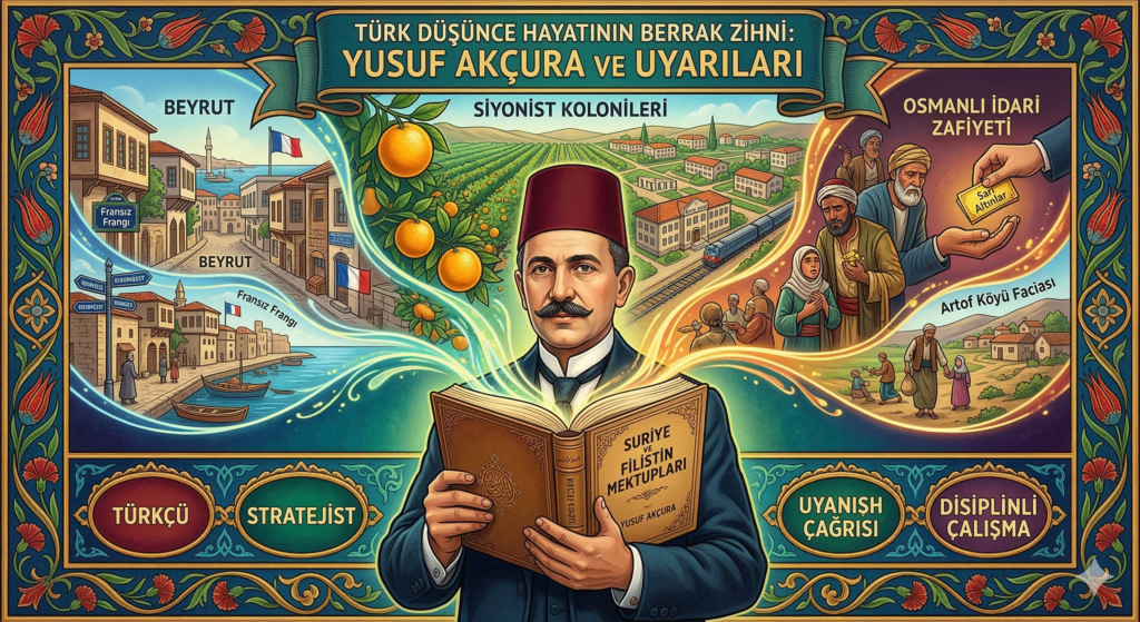 Yusuf Akçura’nın vefat yıl dönümü vesilesiyle kaleme alınan bu metin, yazarın 1913 tarihli Suriye ve Filistin Mektupları isimli eserindeki stratejik öngörüleri incelemektedir. Akçura, Osmanlı’nın son döneminde bölgedeki Fransız kültürel hegemonyasını, Batılı devletlerin kurumsallaşmış nüfuz çabalarını ve Siyonist yerleşimlerin disiplinli yükselişini bir stratejist gözüyle rapor etmiştir. Kaynak, imparatorluğun idari zafiyetleri ile yolsuzluklar neticesinde kaybedilen toprakları vurgularken, bu durumun karşısına milli bir alternatif konulamamasını eleştirmektedir. Bölgedeki sosyal ve ekonomik dönüşümü saha gözlemleriyle aktaran yazar, vatan savunmasının sadece sloganlarla değil, bilim, disiplin ve iktisadi teşkilatlanma ile mümkün olabileceğini savunur. Nihayetinde bu kaynaklar, Akçura’nın bir asır öncesinden yaptığı uyarıların günümüz Ortadoğu gerçekliğiyle olan sarsıcı benzerliğine dikkat çeken bir tarihi manifesto niteliğindedir.