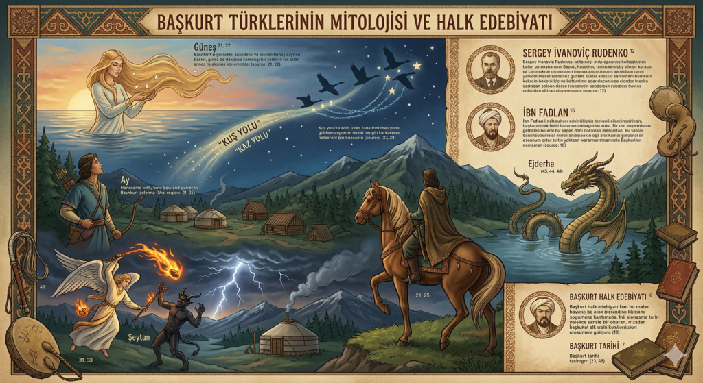 Bu makale, Başkurt Türklerinin köklü tarihini, zengin mitolojik dünyasını ve sözlü edebiyat geleneğini kapsamlı bir şekilde ele almaktadır. Yazıda, halkın doğa olaylarını açıklama biçimleri, Güneş ve Ay hakkındaki efsaneleri ile yılan ve ejderha gibi figürlere yükledikleri olağanüstü anlamlar detaylandırılmaktadır. Ayrıca, Başkurt kültürünün Şamanizm ve İslam gibi farklı inanç sistemlerinden nasıl etkilendiği, Sergey Rudenko gibi araştırmacıların çalışmaları ışığında sunulmaktadır. Özellikle 1990’lı yıllardan itibaren hız kazanan derleme çalışmaları ve yayımlanan dev külliyatlar, bu kültürel mirasın gelecek nesillere aktarılmasındaki önemi vurgulamaktadır. Sonuç olarak kaynak, Başkurtların evren algısını ve toplumsal hafızasını şekillendiren efsanevi unsurları bir bütün olarak yansıtmaktadır.