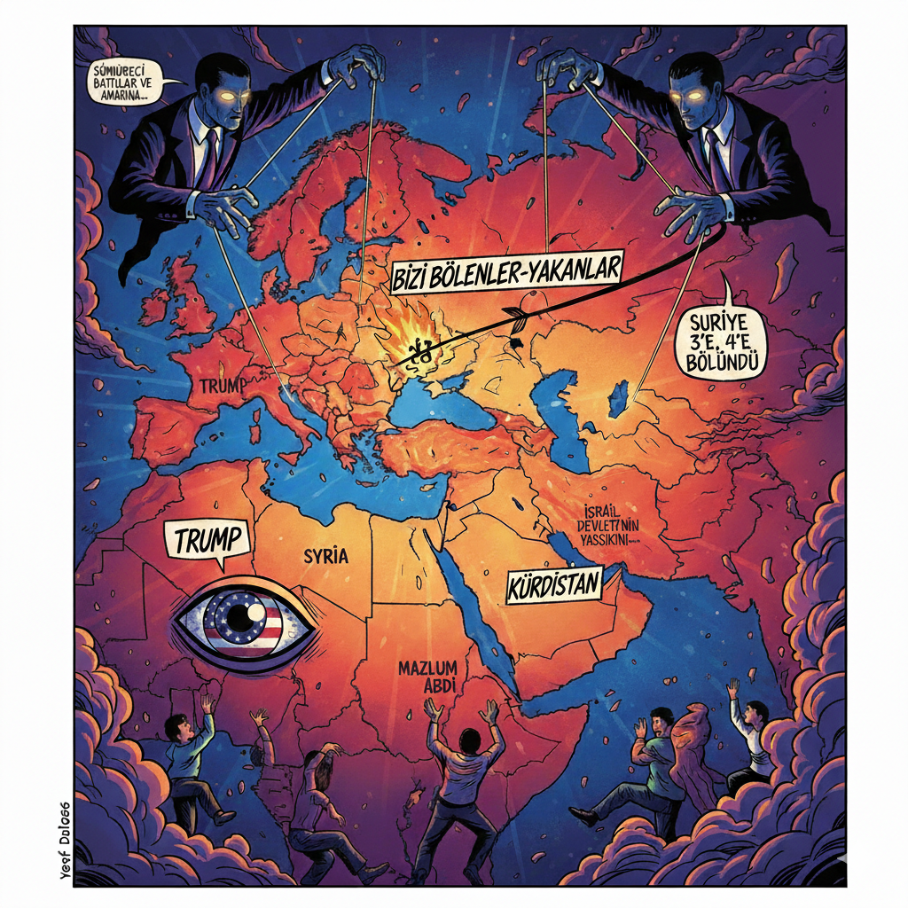 Yazar Yusuf Dülger tarafından kaleme alınan bu metin, Orta Doğu’daki siyasi istikrarsızlığın ve komşu ülkelerdeki bölünmelerin arkasında emperyalist güçlerin ve Siyonizm’in bulunduğunu ileri sürmektedir. Suriye, Irak ve İran gibi ülkelerin parçalanmasının Türkiye için büyük bir güvenlik tehdidi oluşturduğu vurgulanırken, bölgedeki ayrılıkçı faaliyetlerin dış destekle yürütüldüğü savunulmaktadır. Metin, Türkiye’nin geçmişteki dış politika tercihlerini ve siyasi liderlerin açıklamalarını eleştirel bir süzgeçten geçirerek, bu süreçlerin bölge barışına zarar verdiğini iddia etmektedir. Dini ve milliyetçi kurumların komşu ülkelerin yaşadığı yıkımlar karşısındaki sessizliği kınanmakta ve toplumsal bir uyanış çağrısı yapılmaktadır. Sonuç olarak yazar, halkı bölgeyi ateşe atan politikalara karşı duyarlı olmaya ve birliği savunarak bu tehlikeli gidişata dur demeye davet etmektedir.