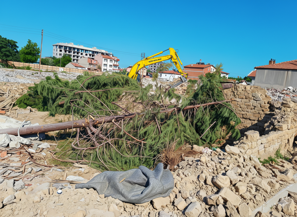 Konya’da, toplu imara açılan bahçeli evlerin önündeki çamların dozerlerle sökülüp atıldığını görüyoruz (çektiğim bir fotoğrafı aşağıya alıyorum).
