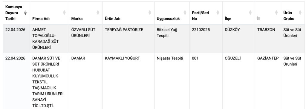 Süt ve süt ürünlerinde de benzer usulsüzlükler ortaya çıktı. Trabzon ve Ordu’daki bazı işletmelerin tereyağlarında bitkisel yağ kullanıldığı belirlenirken, Gaziantep’te üretilen bazı yoğurtlarda yine bitkisel yağ ve nişasta tespit edildi.