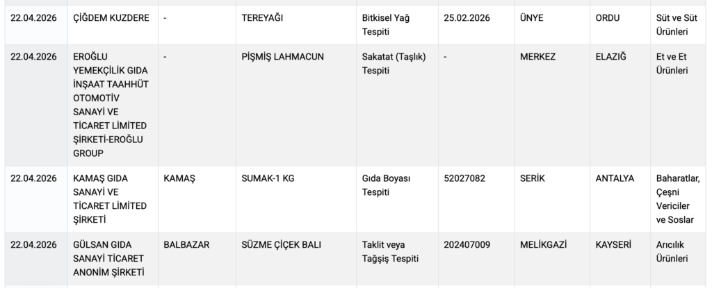 Taklit ve tağşiş listesinde yer alan diğer ürünlerde de dikkat çeken bulgular yer aldı. Elazığ merkezli bir firmanın ürettiği lahmacunda sakatat (taşlık) kullanıldığı tespit edildi.