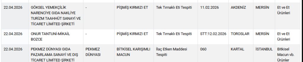 Yayımlanan listede en çarpıcı başlıklardan biri, iki farklı firmanın ürettiği tantunide tek tırnaklı hayvan eti bulunması oldu. Mersin’in Akdeniz ilçesinde faaliyet gösteren Göksel Yemekçilik firmasının 11 Şubat 2026 tarihli parti numaralı pişmiş et ürününde at eti tespit edildi. Firmanın ürünlerini İstanbul ve Ankara dahil olmak üzere birçok ilde satışa sunduğu belirtildi.