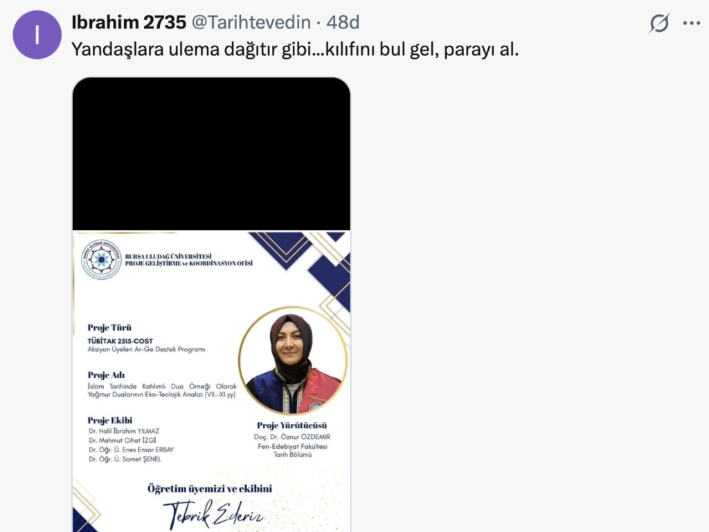 Bursa Uludağ Üniversitesi’nde yürütülen ve “İslam Tarihinde Katılımlı Dua Örneği Olarak Yağmur Dualarının Eko-Teolojik Analizi” başlığını taşıyan proje, TÜBİTAK’ın 2515-COST programı kapsamında destekleniyor. Bu program çerçevesinde projelere 3 milyon TL’ye kadar bütçe sağlanabiliyor.